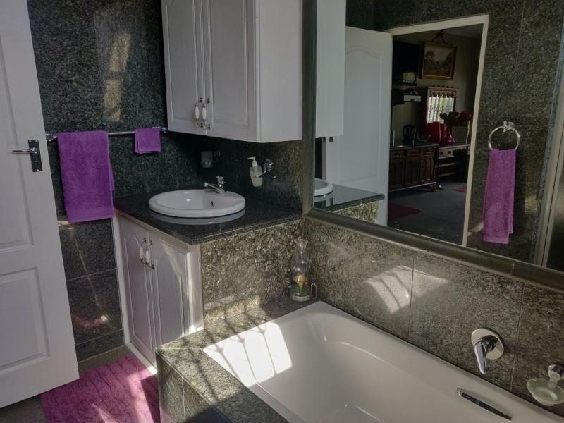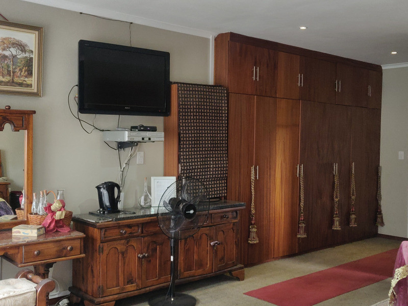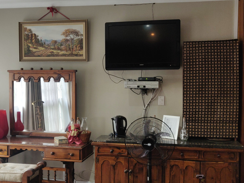 The Main room is a fully furnished room that comes with an en-suite bathroom fitted with a bath and a shower, a small kitchenette (only suitable for heating up food, no cooking), a desk, fan and several cupboards plus a King-size bed. The apartment includes a microwave, bar fridge, kettle, DSTV TV, and crockery/cutlery.