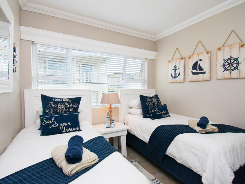 This unit, located on the first floor, encompasses 3 bedrooms. The apartment boasts tasteful and rest-inducing coastal-themed decor. The main bedroom features a generous queen-sized bed with an en-suite bathroom equipped with a shower, toilet, and basin. The second bedroom also offers a queen-sized bed, while the third bedroom presents 2 single beds. The second bathroom boasts a bath, toilet, and basin. The two front-facing bedrooms open up to the full-length balcony and even offer sea views from the bed. All rooms are adorned with white, hotel-quality percale linen and plush comfortable beds. Air-conditioning in the living area and main bedroom ensures comfort on warm balmy summer days.