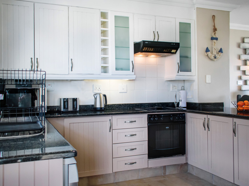 The lounge offers cozy seating, an FHD TV with a full Premium DStv bouquet, a DVD player, and in the age of connectivity, rest assured, free uncapped Wi-Fi is available. The living room seamlessly connects with the covered patio through folding stack doors, where you’ll find furniture, braai facilities, and breathtaking views.