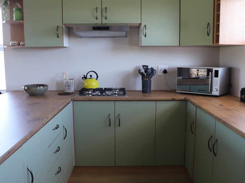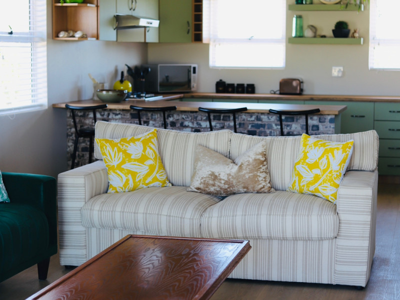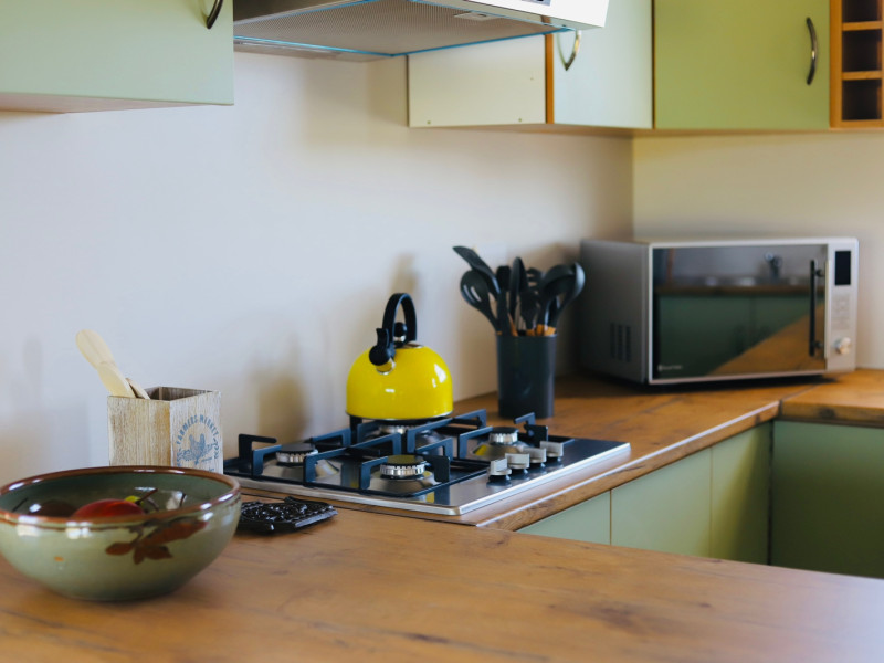 The main living area features an open-plan design with a kitchen and a lounge. The kitchen is fully equipped with a stove, oven, microwave, fridge-freezer, cutlery and crockery as well as a 4-seater breakfast bar. The lounge contains a single sleeper couch and a TV with Netflix and streaming.