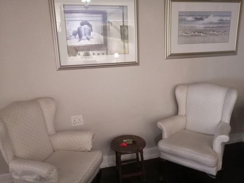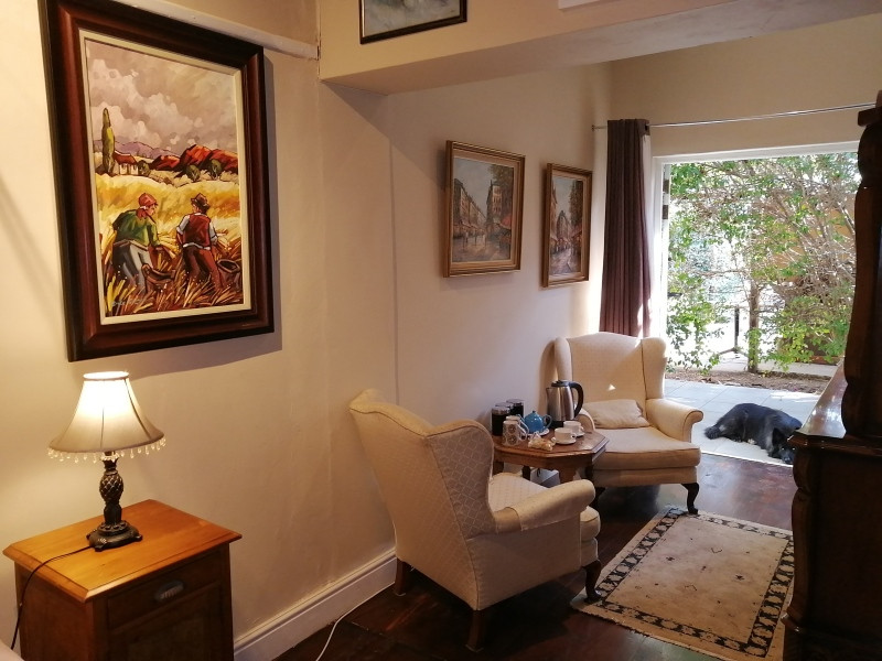 The cottage offers an open plan kitchen and living room, equipped with large comfortable couches, a media centre and DSTV with a DVD player. The kitchen is fully equipped with all crockery and cutlery, including a kettle, toaster, fridge and freezer, microwave and electric oven with a hob. The private patio has an outdoor table and chairs plus a Weber braai and stunning views of the mountain.