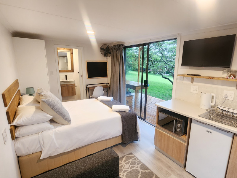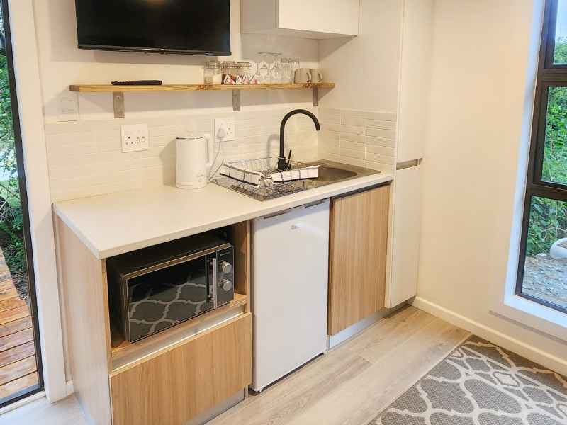 The tiny homes have everything for self-catering, including a fridge, microwave, stove, kettle and gas braai. Netflix, fast uncapped wifi and workspaces are included in every unit.