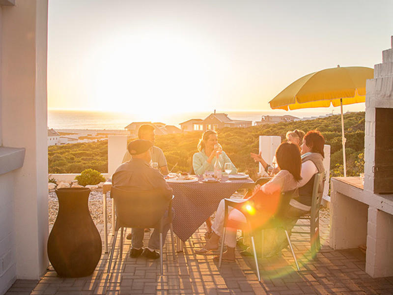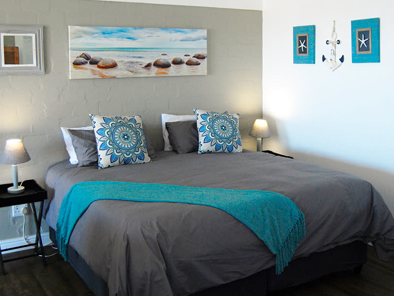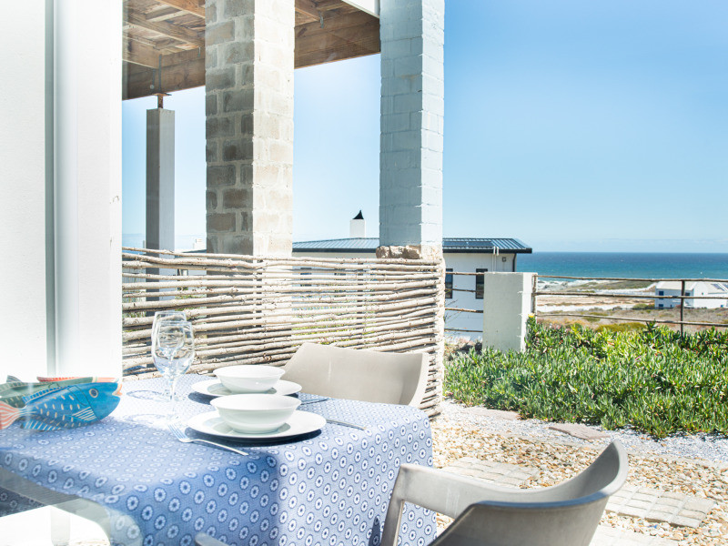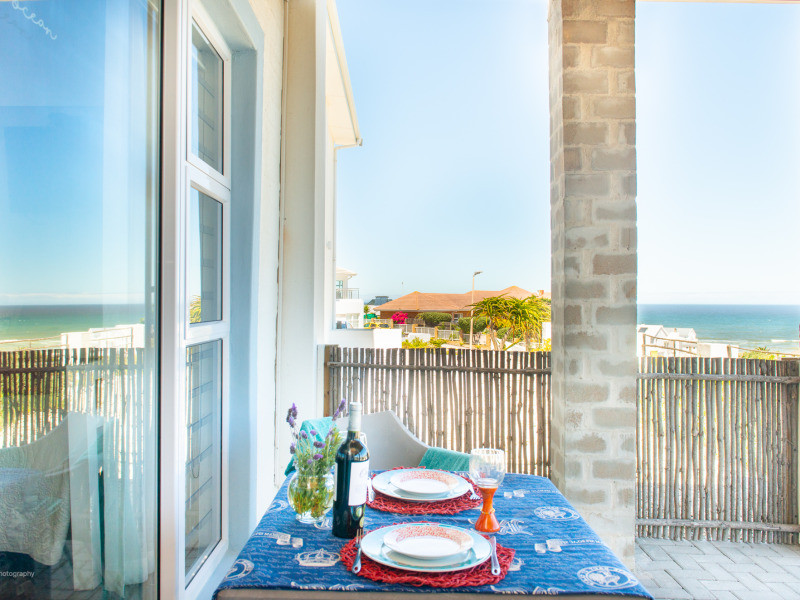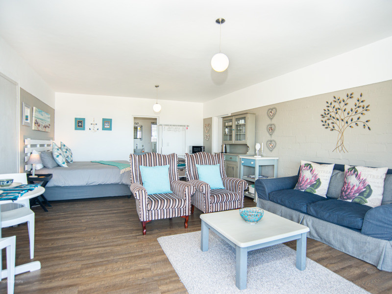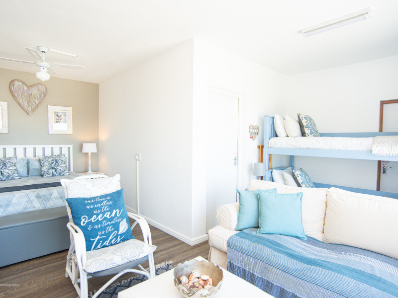OCEAN is a luxury suite facing the ocean and a view of the Green Fynbos area. It has a separate bedroom with a Queen Bed and a Bunk bed. It has another daybed in the adjacent living area. The living area has ample seating and a table and chairs. It also has a kitchen equipped with a Gas stove and oven, kettle, electric frying pan, toaster, egg boiler, crockery and cutlery. It has one bathroom with a shower. You also have your own patio with a table and chairs. A Weber braai is supplied on request.