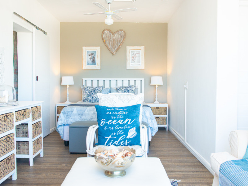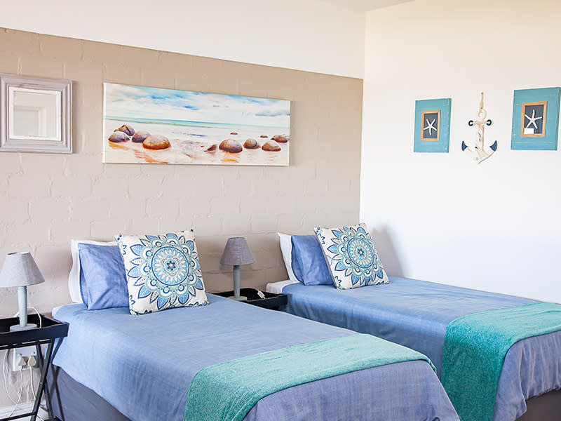 SEASHELLS is a very spacious open-plan, luxury suite facing the ocean and green belt and has two single beds that can be converted into a super king-size bed. It has a spacious seating area and a private bathroom with a shower. It is equipped with its own kettle, crockery and cutlery, toaster, microwave, small fridge and a patio with a table and chairs. A portable braai can be supplied upon request. Please note, it does not have a mini kitchen.