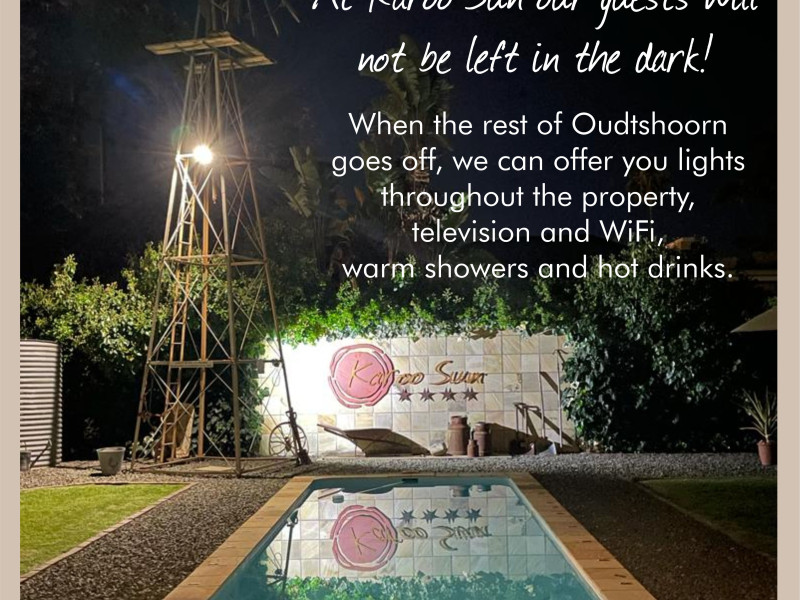Karoo Sun is situated within walking distance of restaurants, hospitals and shops. Surrounding towns like George, Mossel Bay and Prince Albert are just 45 minutes to 90 minutes drive away. This makes Karoo Sun the ideal location from where you can undertake your day trips. The George Airport is 50 minute drive away and an airport shuttle can be arranged at a charge.