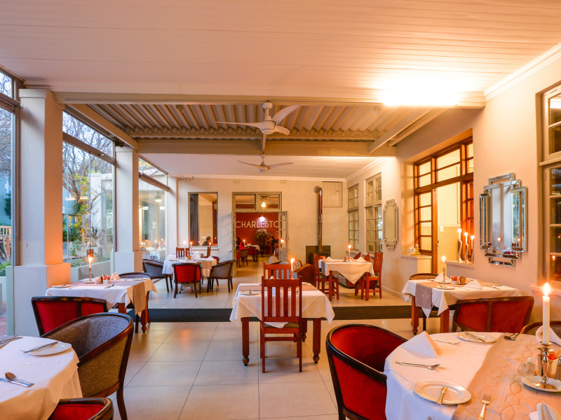 Charlestons Restaurant serves breakfast and dinner. Breakfast is served in our spacious Breakfast Room and glass-enclosed Garden Patio overlooking the lush green gardens that the Montagu Country Hotel is renowned for. Dinner is a somewhat more formal affair. Chef Werner Blom enjoys the challenge of fusing traditional South African cuisine with fine dining flair and presentation. Dine by romantic candlelight in a classical setting reminiscent of days gone by. Is this the 21st century? NO, we are back in the days when serving was still an art.