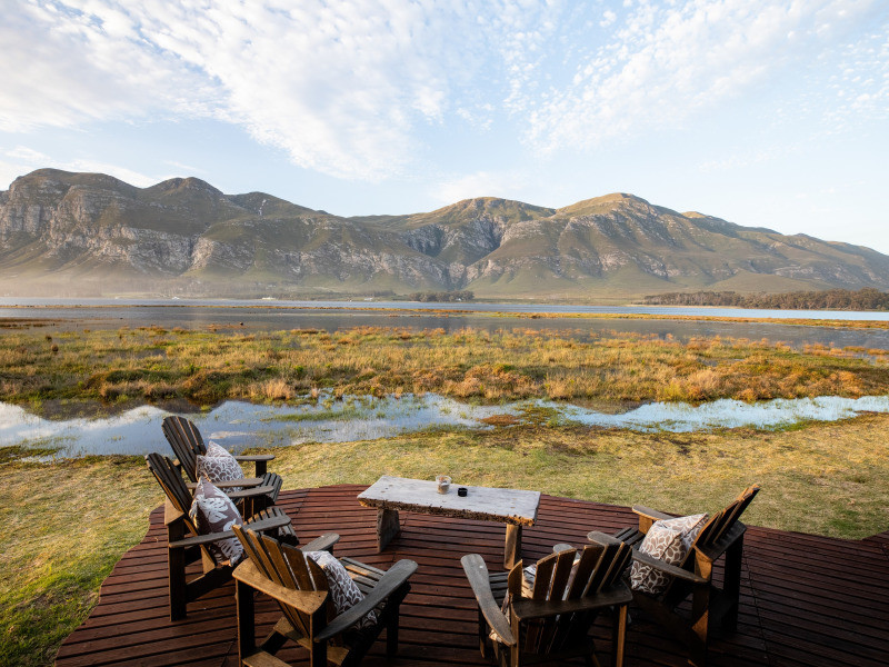 For the ultimate private getaway, Mosaic Lagoon Lodge captures the essence of tranquillity with just five safari-style suites secluded among ancient Milkwood trees on the edge of the Hermanus Lagoon. Stone and glass walls open onto private decks with gorgeous mountain views. Each room has beautiful soft netting surrounding a king bed, a sitting area, a writing desk, a fireplace and a ceiling fan. The bathrooms are fitted with a large romantic tub, copper sink and a private outdoor shower for an “African bush” experience. Twin beds can also be accommodated. The chalets of the Lagoon Lodge are beautifully built with stone and thatch harvested from Mosaic.