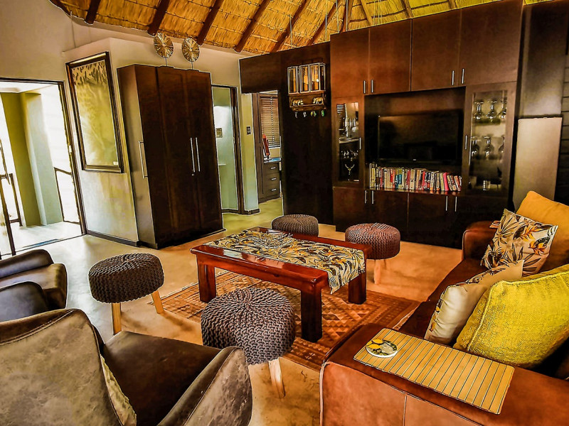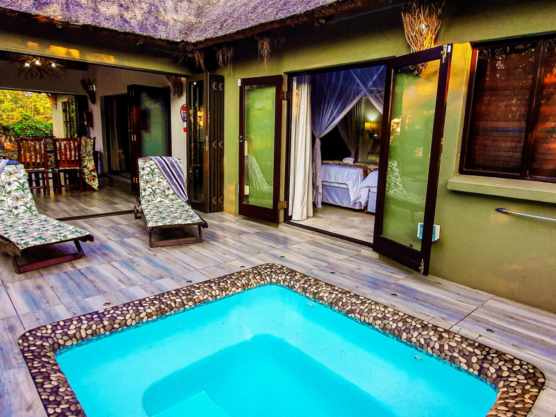 A stylish and spacious home comprises 2 en-suite bedrooms and an open-plan kitchen with a living area that leads onto an enclosed dining patio. This seating overlooks the braai area, splash pool and luscious surroundings. Bird watching fulfils all expectations.