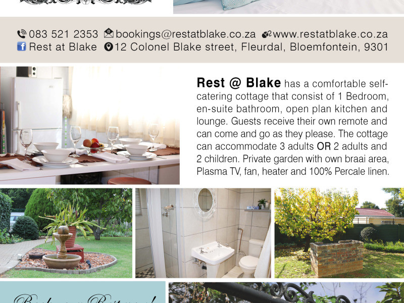 Rest@Blake has a comfortable private self-catering cottage with 1 bedroom, en-suite bathroom, open plan kitchen, and lounge. Guests receive their own access remote and can come and go as they please. The cottage can accommodate 4 people. Hospital patients, visitors, guests on holiday, or business people visiting Bloemfontein are all welcome. Our Cottage is a mere 2km with easy access from the N1 Highway and 800m from the closest convenience center where there is a Pick&Pay, Pharmacy and some takeaway restaurants