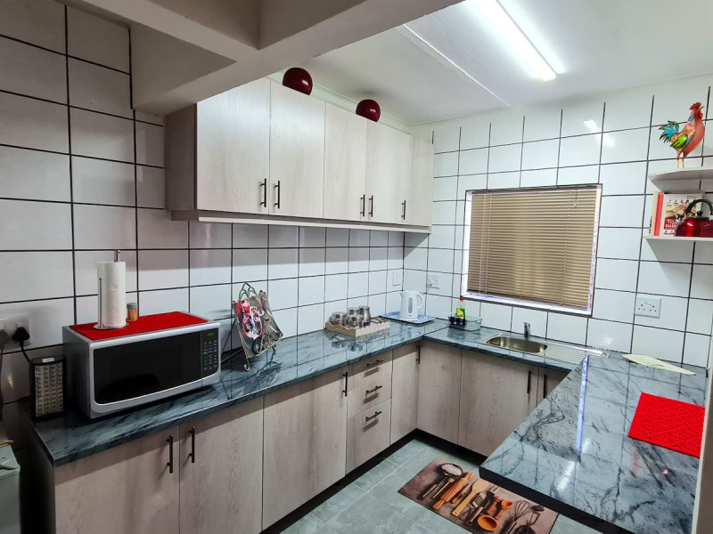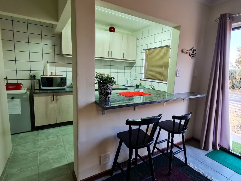 The kitchen is fully equipped for self-catering with a fridge, two-plate stove and an oven. This unit has DStv, Wi-Fi and a covered braai. There are turn-power lights and a one-plate gas stove in the case of load shedding.