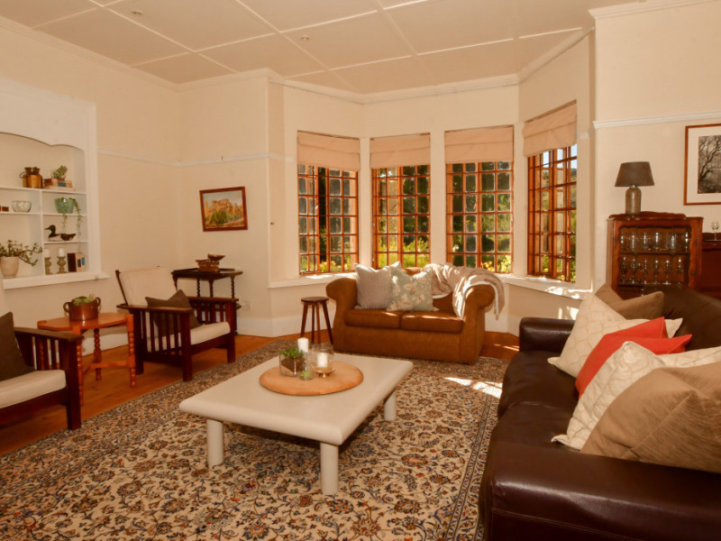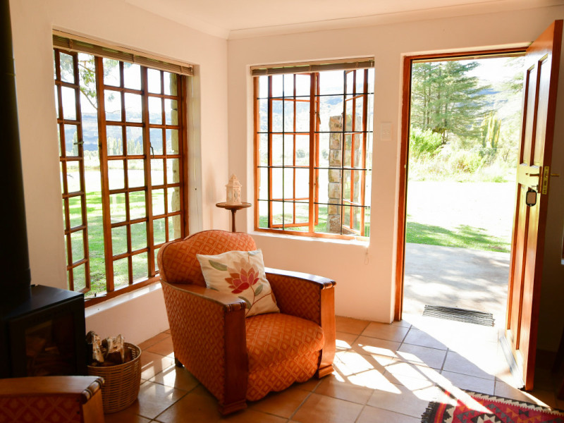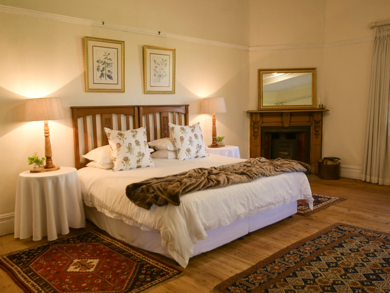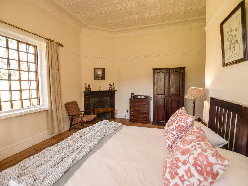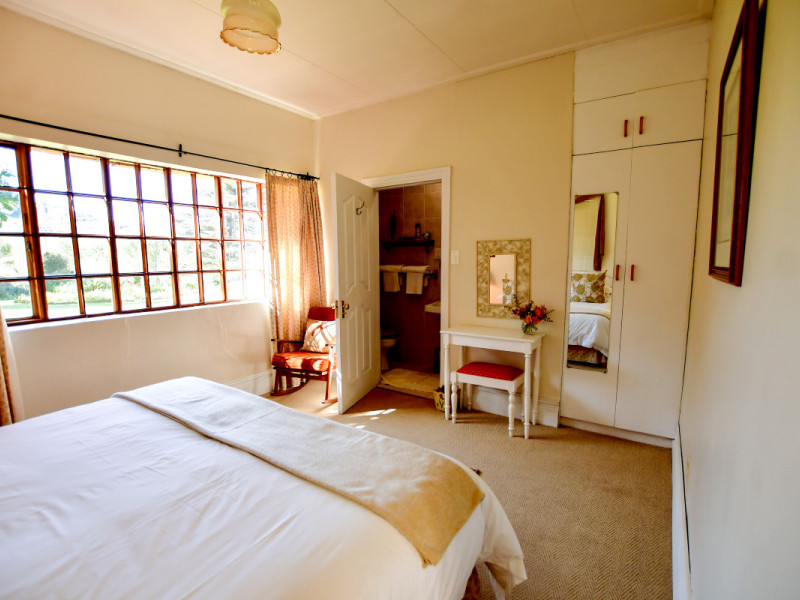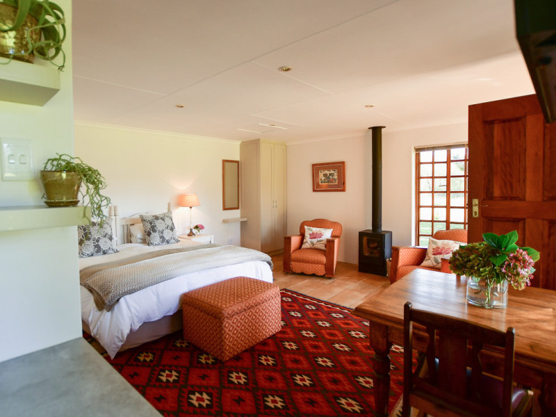 The Main House has 3 en-suite bedrooms, a large kitchen, a spacious lounge with a log fireplace, and a dining room. A veranda overlooks the country garden with the Mushroom Rock in the background.