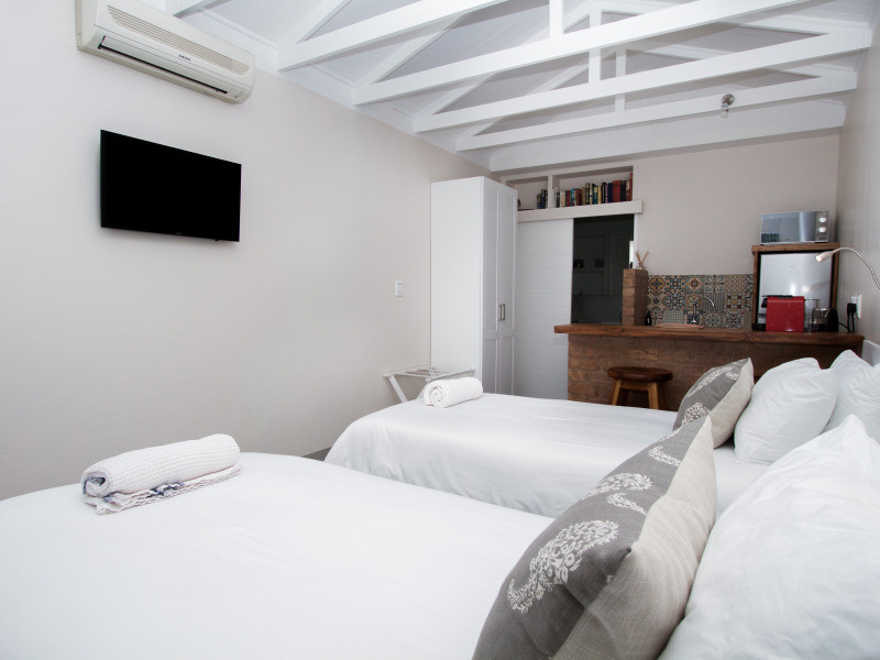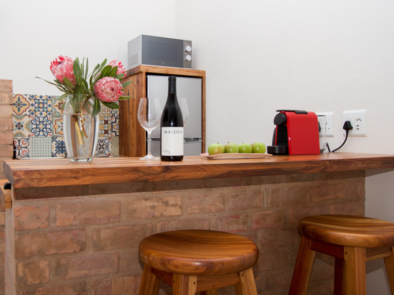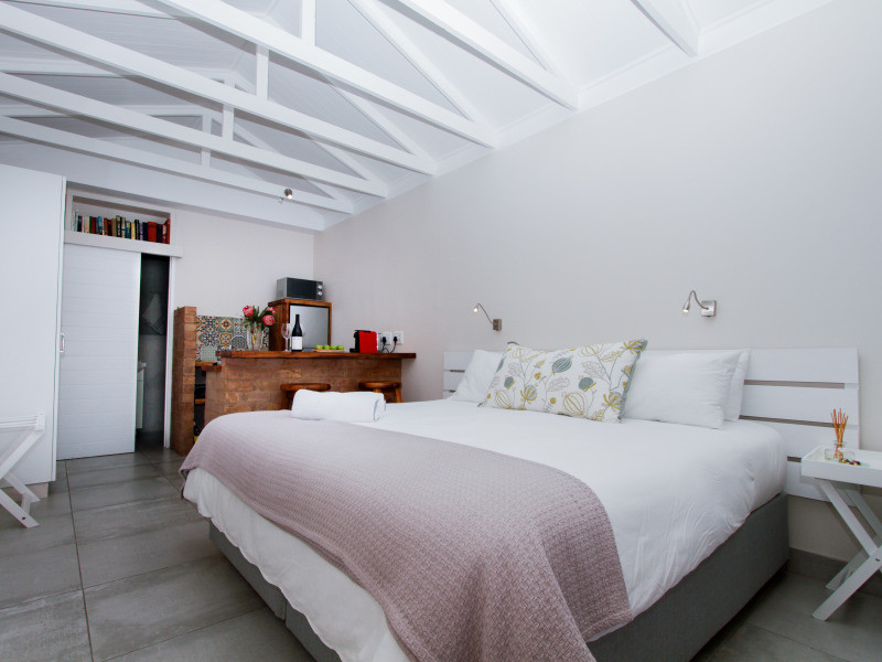 The room is a lovely sized open plan bedroom and self-catering kitchenette (microwave, toaster, coffee machine, braai) with the option of a king-sized bed or two single beds. It is light and airy with a bathroom en suite. Private courtyard to relax in with its own private entrance and parking.