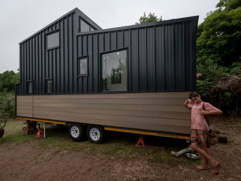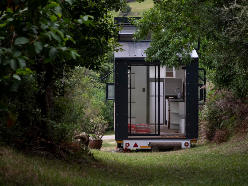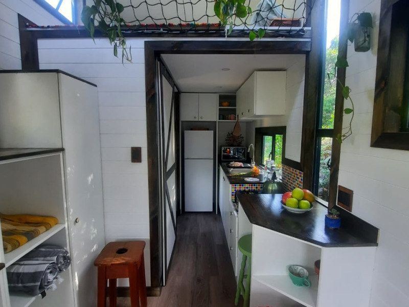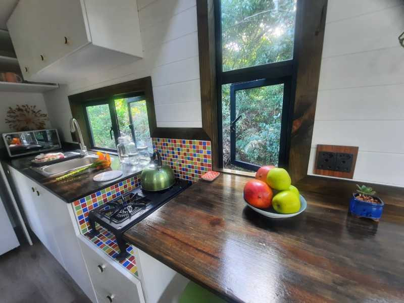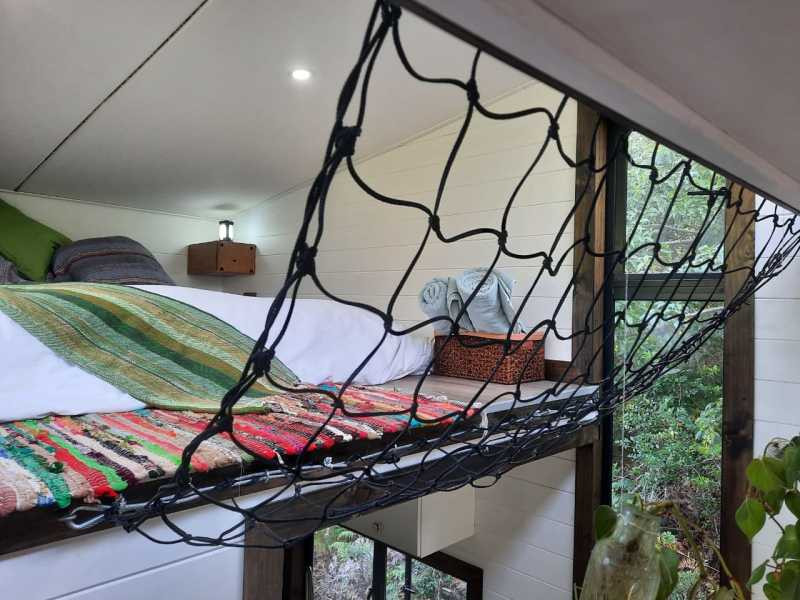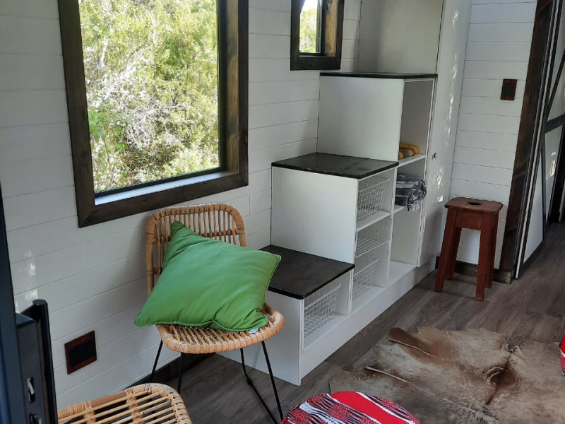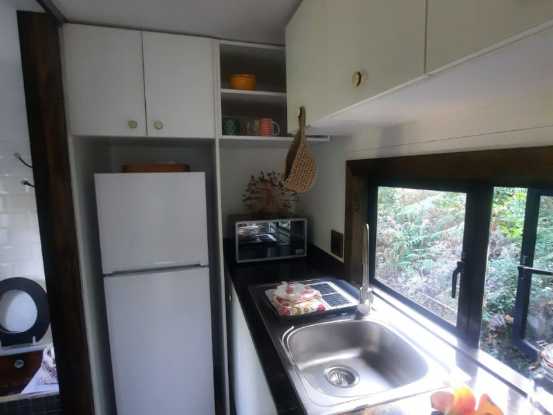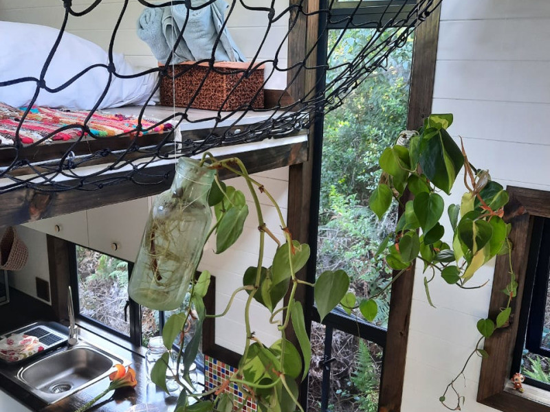 This tiny home is cosy and can accommodate 2 guests at a time. It comprises a bedroom which features as a loft space and is furnished with a double bed. A shower, washbasin and compost toilet are available in the bathroom which is situated on the lower level. All linen and bath towels are provided.