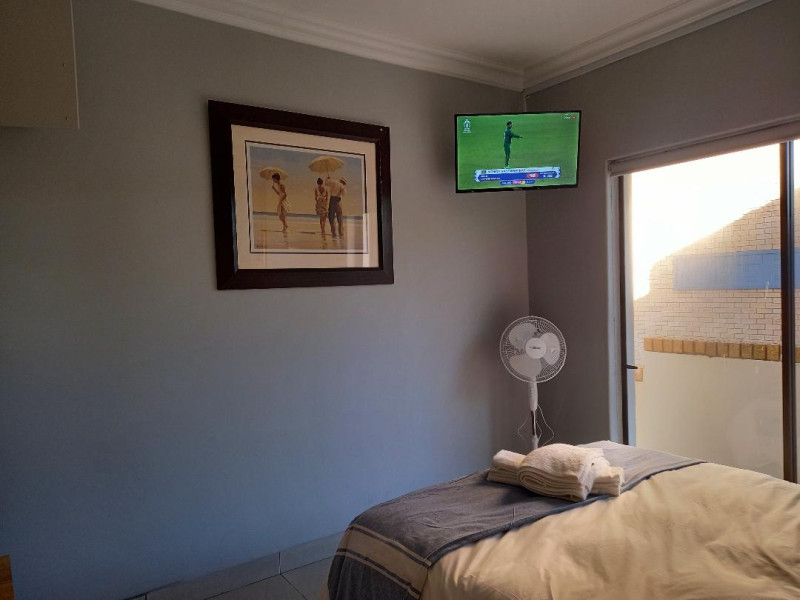 Entertainment is provided with a TV and a full DSTV package in each room, along with complimentary limited Wi-Fi. Secure on-site parking is available for 1 vehicle, and off-site parking options are also accessible. The unit is equipped with a solar system to ensure power during periods of electricity outage.
