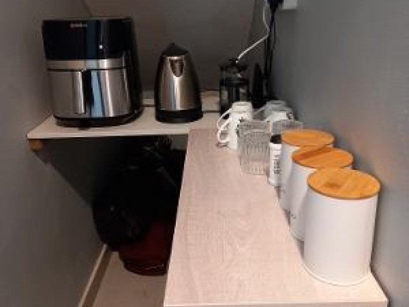 The unit is equipped with a microwave, air-fryer and bar fridge, as well as tea- and coffee-maķing facilities. Guests will find all the necessary dining essentials, including plates, knives, forks, glasses and wine glasses.