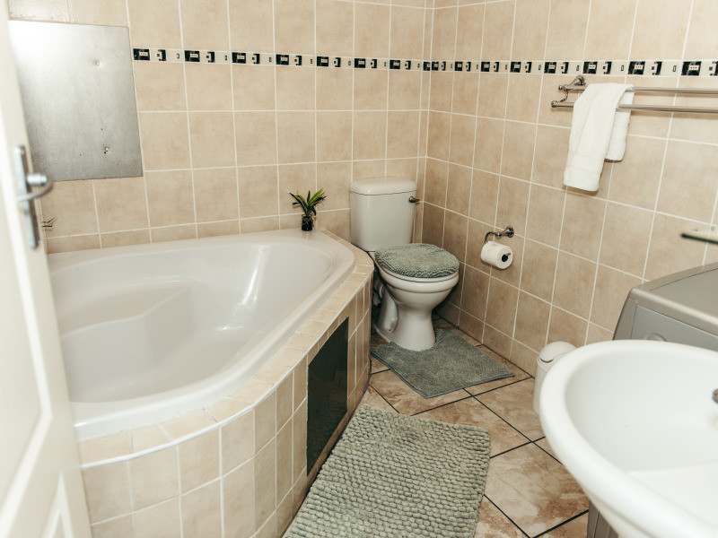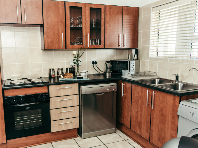 The kitchen is fully equipped for self-catering and includes a double-door fridge, a dishwasher, a microwave, a washing machine, and a tumble dryer. The TV lounge contains a 48-inch LED TV with full DSTV and a DVD player.