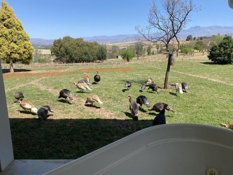 24ha property - 3 x cottages (far apart) with ample space to walk/play. Electric fencing around the farm & alarms in cottages. 2 dams & a cement reservoir/swimming pool. DAMS ARE NOT FENCED - keep kids close to you... Many bird species, 4 friendly dogs, 3 cats, turkeys & chickens roam the farm.