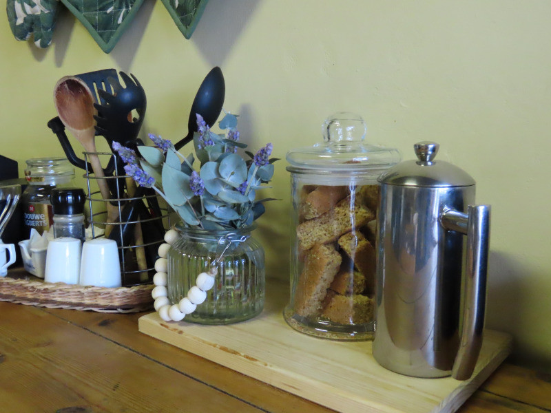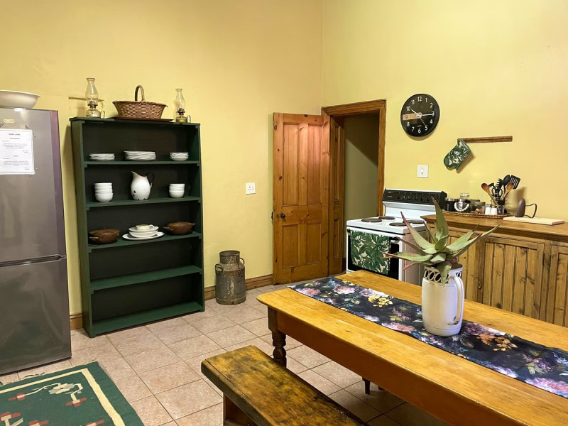 The rustic kitchen is equipped with a stove, oven, fridge, microwave, kettle, crockery and cutlery. The Dover wood stove makes for cosy winter evenings. The lounge boasts comfortable seating. There is a lovely patio with farmland views and there are braai facilities for guests' use.